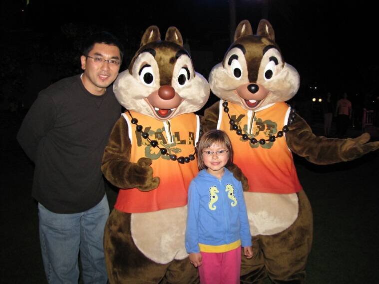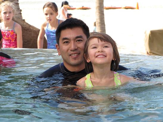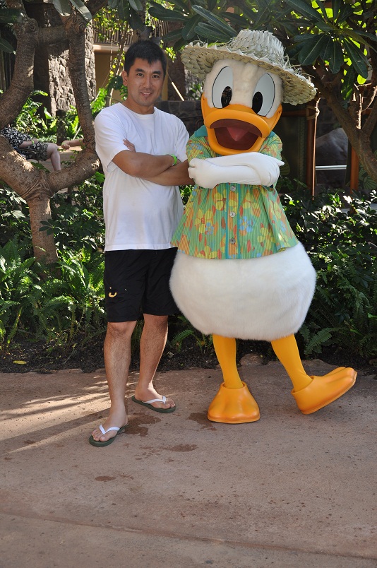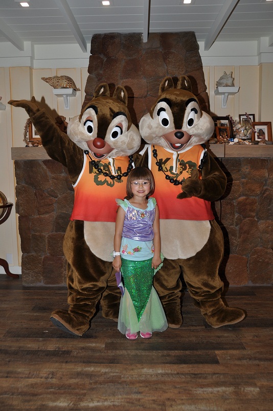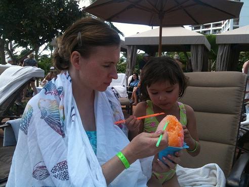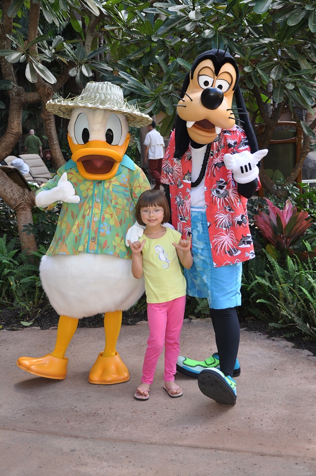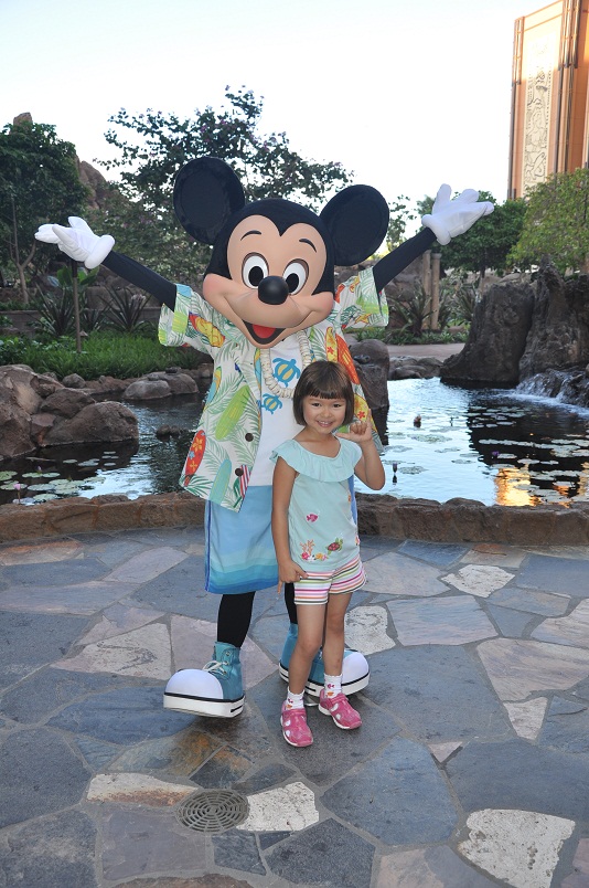 We spent the afternoon taking photos back at the resort with Donald and Goofy, playing in the pool and hot tub (how do kids do it - our daughter went into the cold pool, jumped in the hot tub and back into the cold pool again, only to repeat this over and over), and having shaved ice on the pool side (note: to keep unwanted guests, you must check in to receive your wrist band for the day. They check your name off using your card key, and make sure that you have not already checked in. And if you want your badge of honor, you keep those wrist bands on day after day, and by the end of the trip, you'll have a rainbow of wrist bands. But why people, why? Anyway, The check in is conveniently located next to the fresh towels. Also - the free water stations are a great idea). Our daughter went running back to Aunty's Beach House once more until dinner, where she (now Snow White), Sleeping Beauty (another little girl), and other princesses learned the hula. We as parents went back to the room to watch TV and play Angry Birds because we were already tired... how pathetic.