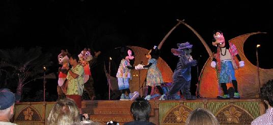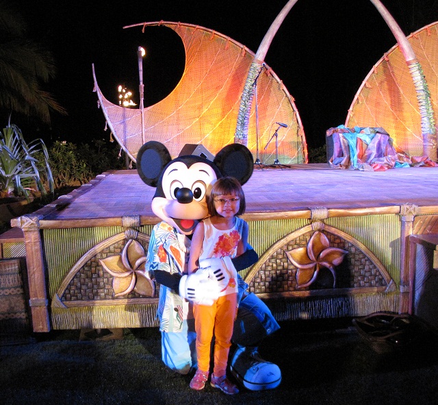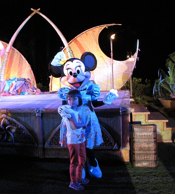 On this night, we decided to have prepared dinner from the grocery store - we wanted to be there early for Starlit Hui (7pm, Mondays and Thursdays only, so book your trip accordingly!). We quickly grabbed our seat on the mat floor (no chairs) and secured our spot, and looked around the several Hawaiian crafts activities which they made available to people to participate. The dancers also gave ad hoc dance lessons to the little kids. The official show started way past 7pm - maybe it was closer to 7:30. The show itself was wonderful - there were beautiful hula dances to some great singing, fast paced ukulele by the duo Heart & Soul, some traditional Hawaiian music, and lots of kid participation. This part of the show must have only lasted maybe 45 minutes, but it was terrific - dare I say better than Ha at the Polynesian Cultural Center? But the real fun started when the characters came - Mickey, Minnie, Goofy, Stitch, Chip & Dale - in a big dance party where kids and grown ups alike were shaking heir booty and line dancing. The show ended with more character photo ops, and it was all done by around 8:30.