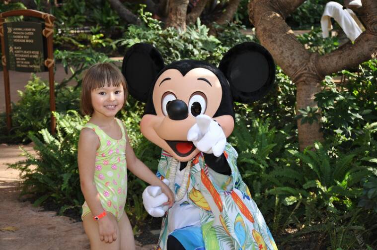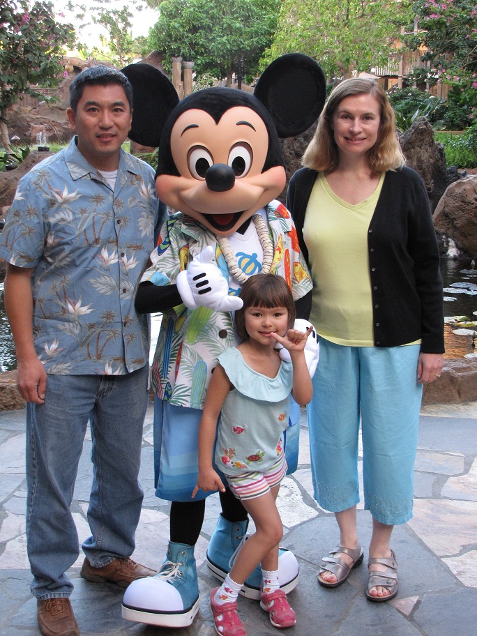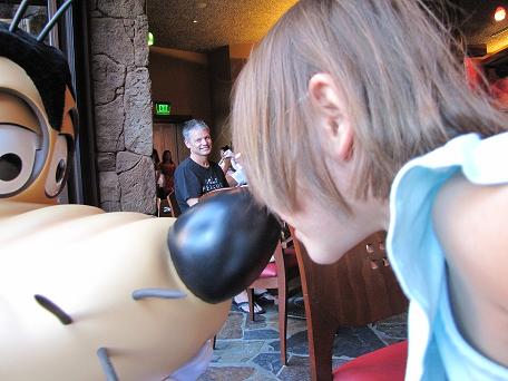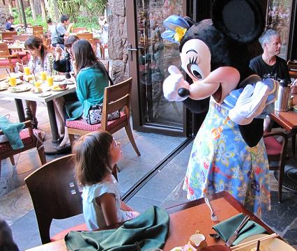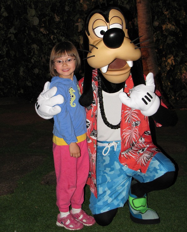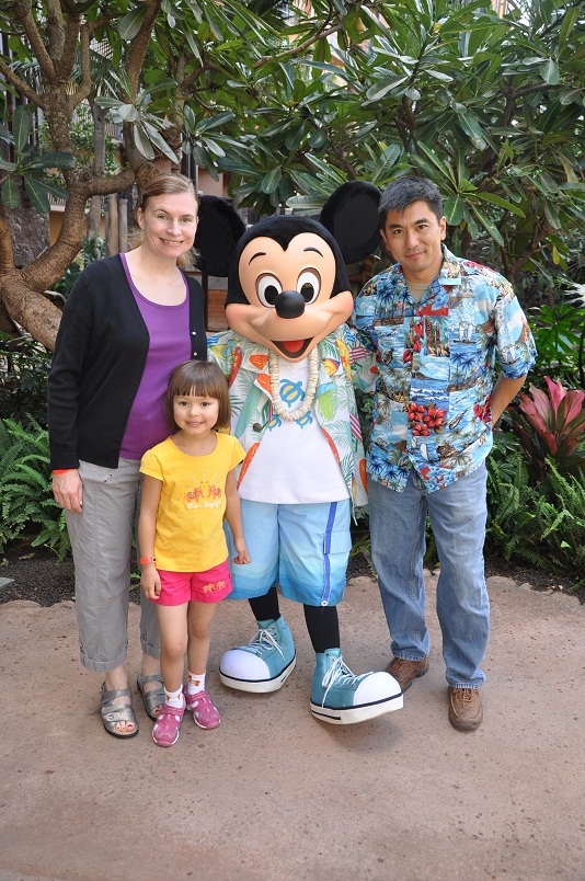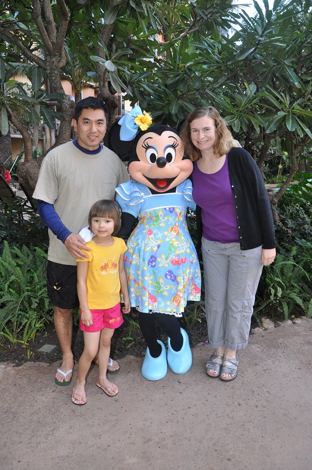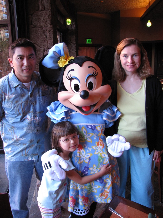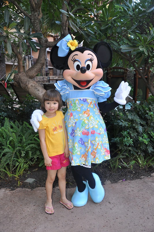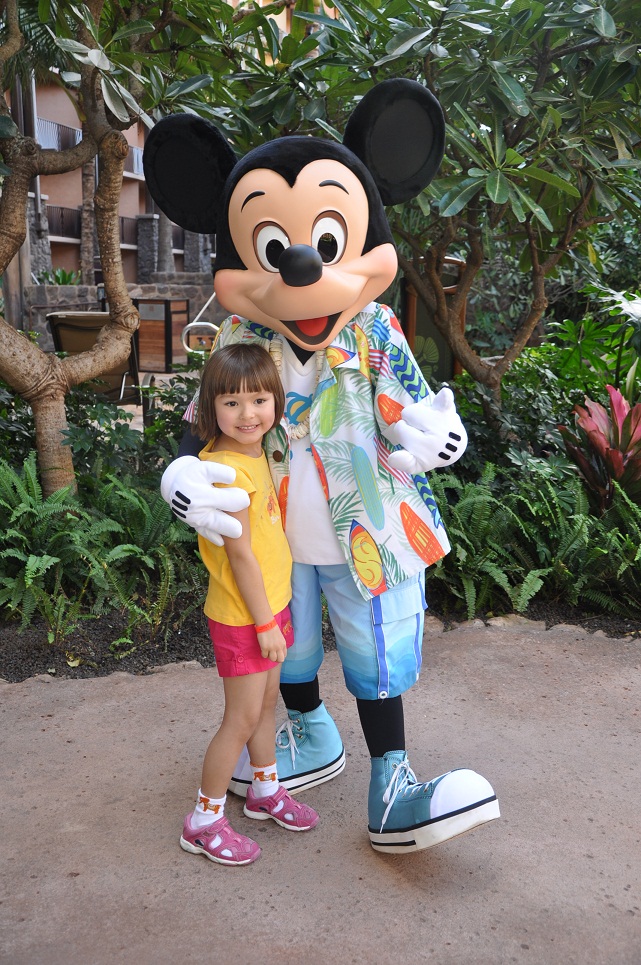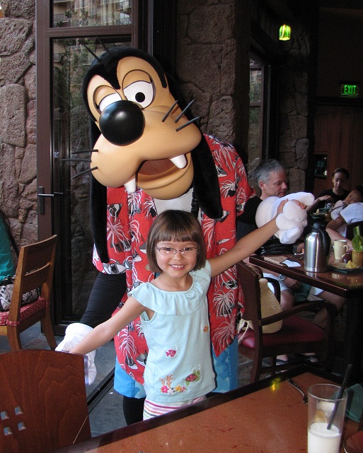 On this day, we had the character breakfast. An important thing to note is that they only have this event on Wednesdays, Fridays and I believe Saturdays, and reservations are required way ahead of time (we booked our breakfast a month ahead). Of course, by this time, we had greeted just about all the characters (I'm sorry to report, no princesses in swimsuits). We first checked in at the Makahiki, and were taken to an outside spot where Mickey greeted us for a group photo. Once that was done, we were seated for our breakfast. Only Minnie and Goofy were making their rounds, but it seemed just fine - Aunty kept the crowd going with lots of songs, interaction with the kids, etc., including Aunty and Minnie parading around the restaurant with kids marching in unison (our daughter was proudly hopping around right behind Minnie). Needless to say, our daughter spent more time with the characters or sitting restlessly waiting for the characters to come than she did eating. By the time Minnie and Goofy came to our table, it was nearly an hour into breakfast, but it didn't matter - she had lots of quality time with the gang.
