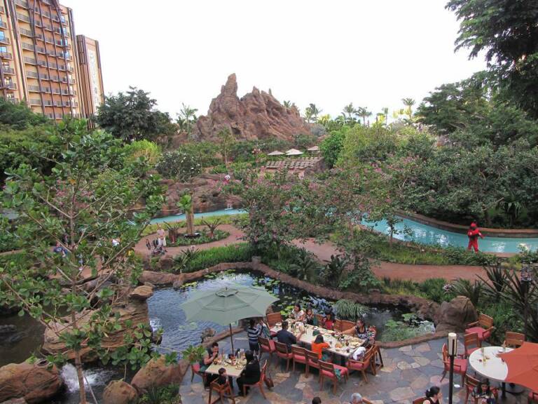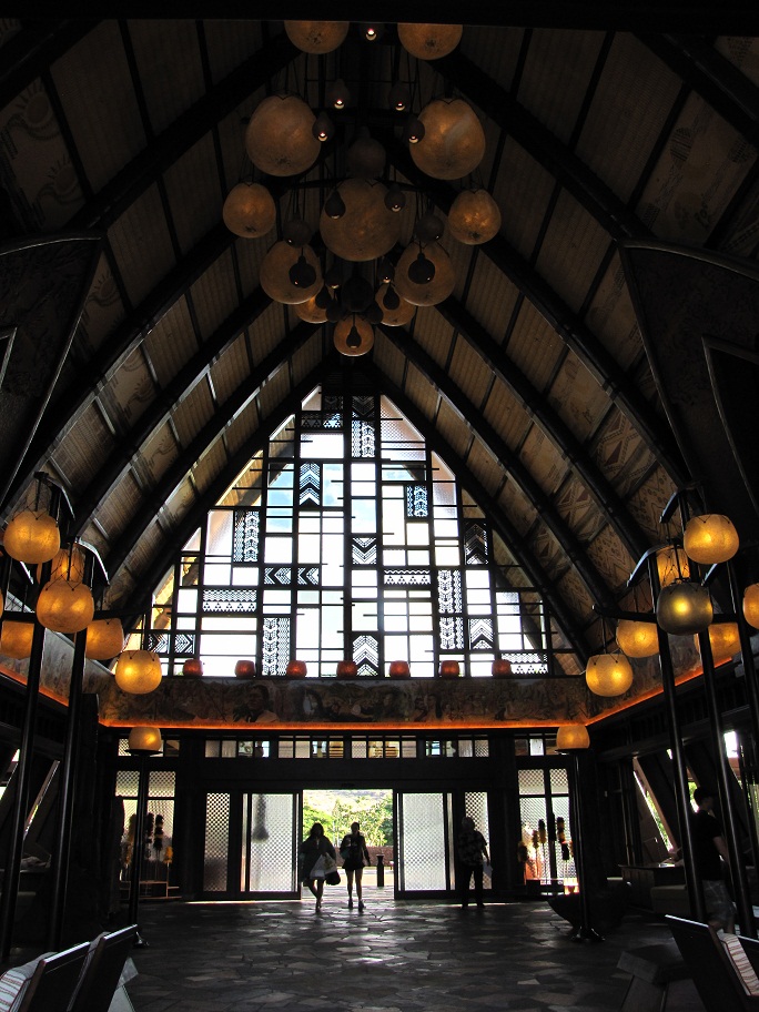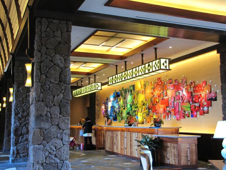 The room was very nicely done - it highlighted Hawaiian culture and crafts as opposed to Disney itself. In fact, the only hint of Disney was a lamp of Mickey. They designed the room well - it was very tastefully done. The only comment I would make is that a partial ocean view could also be a parking structure view - you may be better off getting the pool view on a higher floor. We walked back into the lobby floor, which was beautifully decorated in every direction. There were staff (I mean, cast members) everywhere, all of them very willing to help and share their own wonderful experiences at Aulani.