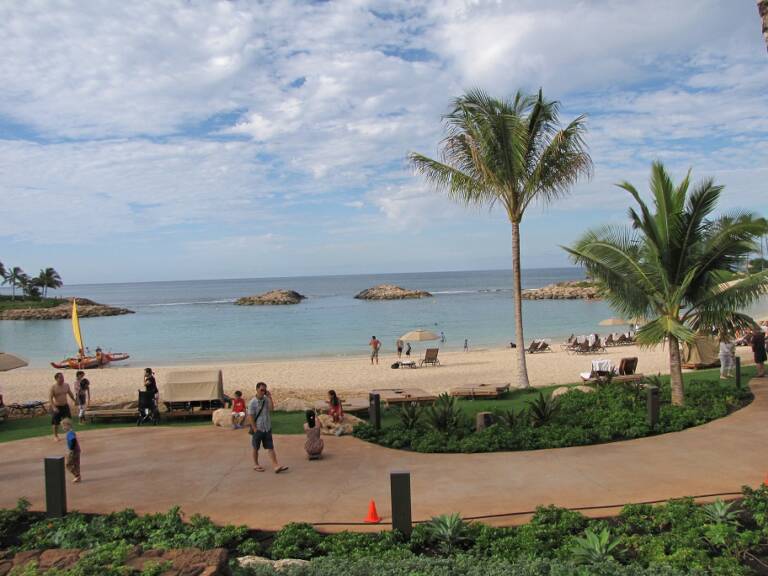 As we arrived in Ko Olina, we passed through a gate with security. I'm not sure whether non-guests of the restaurants/hotels are not allowed, but the security guard had our name on a roster, and we were allowed to proceed. There are two primary hotels here - the JW Marriott Ihilani and Aulani, both of which share a beach in a small lagoon like area. There is also Roy's, which is a very well known restaurant (see also our Oahu trip from the year before), Paradise Cove, which I hear is a very good luau.