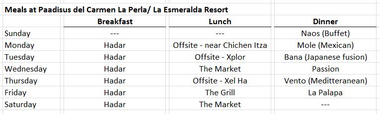 For our first night, we had dinner at Naos, a buffet for families on the Esmeralda side (i.e., family) of the resort. Interestingly, the divide between La Perla and La Esmeralda is a mere partial wall between the two buffets (Hadar and Naos). A small, understated sign on the Esmeralda side is the only indication that there was an adults only section just steps away. The buffet was not crowded, and the food good. There were families with little toddlers and babies in strollers, but within our own little booth, we were relaxed and enjoying a quiet meal. We then walked back to our spacious room where our luggage awaited. See my TripAdvisor comments for more.